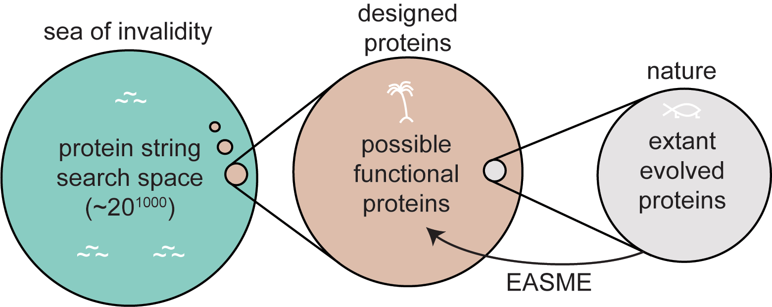 EASME aims to expand the set of extant proteins by colonizing new islands in the sea of invalidity, yielding functional protein strings that can later be produced and analyzed in a lab.