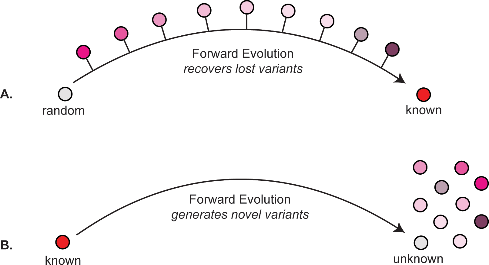 The second way to run EASME is “known to unknown,” where a known entity is forward evolved into the future by implementing a selection regimen that drives towards a desired characteristic phenotype. This methodology outputs Pareto optimal sequences that may have never evolved yet and is effectively a fast forward button on evolution into the future. While this approach would undoubtedly produce many false positives, wet lab work will allow us to test and validate designed proteins while simultaneously honing a given enzyme's fitness function. Biologically measuring the ratio of valid to invalid protein outputs would allow us to optimize the design process (and even if that ratio is low, it will still be orders of magnitude faster than natural evolution, a process which plays out on evolutionary timescales). To achieve both these ends, EASME will employ EA and GP models supplemented with ML where appropriate.